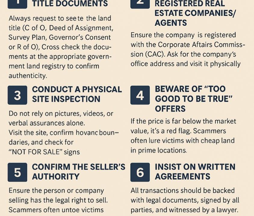 🔑 How to Spot a Good Real Estate Deal: 1. Location Advantage • Proximity to schools, workplaces, transport, and amenities. • Is the area developing (roads, malls, industries, estates, etc.)? 2. Title and Documentation • Clean, verifiable documents (C of O, Governor’s Consent, Deed of Assignment, Survey Plan, etc.). • No legal disputes, family land…
